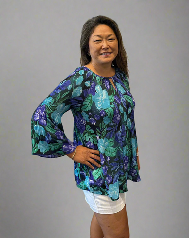 This 3/4 sleeve top showcases a charming blue and purple floral print with flowy sleeves that enhance comfort and movement. Crafted from pleated fa...