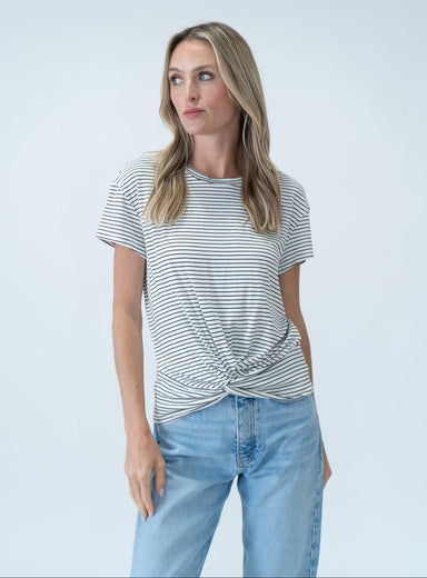 Experience effortless style with the Kelly Twist Bottom Tee in Ivory and Black. This soft, breathable crew neck tee features thin horizontal stripe...