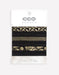 This set of 6 narrow hair ties in black and gold will go with so many outfits. Wear in your hair or dress it up on your wrist by wearing as a bracelet; 3/8” width