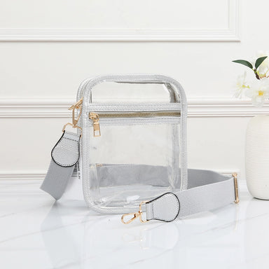 The Gameday Stadium Rectangle Clear Crossbody Bag in Silver offers roomy storage with a large capacity, perfect for carrying your essentials effort...