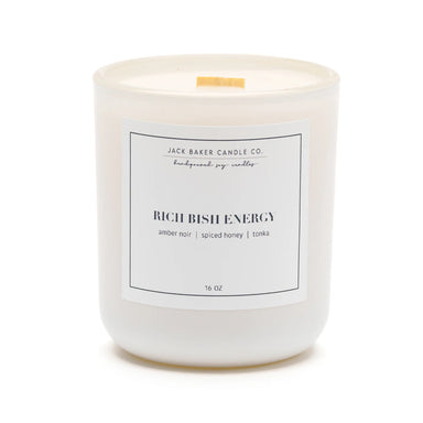 This candle has a white linen painted finish and is adorned with a premium wooden wick. The scent is: Rich Bish Energy - Amber Noir, Spiced Honey,...