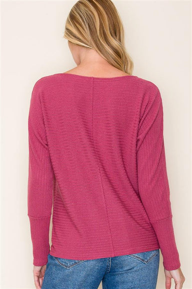 This dark rose top offers lightweight comfort with a soft, textured knit fabric. Its long dolman sleeves and boat neck design create a relaxed fit ...