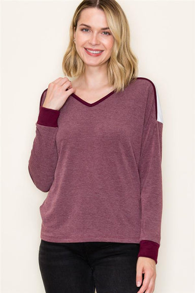 This long sleeve burgundy top features a stylish white color block on the shoulder and a flattering v-neck design. Crafted from soft fabric, it ens...