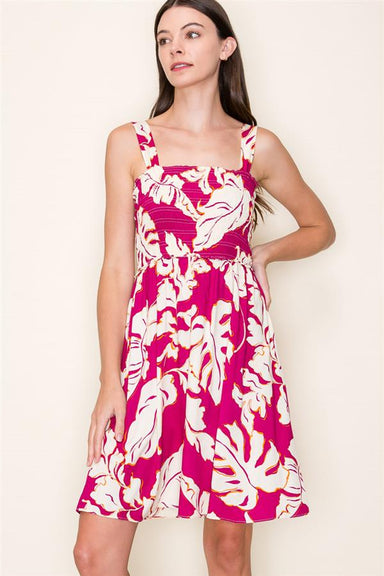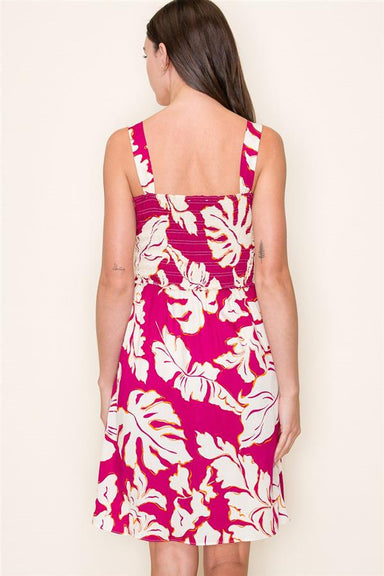 This sleeveless dress features a wide strap and a smocked top for a comfortable, flexible fit. Its vibrant tropical floral print in white and fuchs...