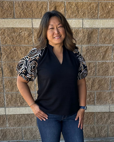 Make a statement with this laid-back puff sleeve top that combines soft black burnout velvet with charming floral accents. The dramatic sleeves bri...