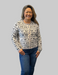 Experience easy comfort with this grey cardigan featuring an abstract black print and elegant gold buttons. The navy trim adds a refined touch, making it a versatile layer that combines style and coziness for everyday wear.