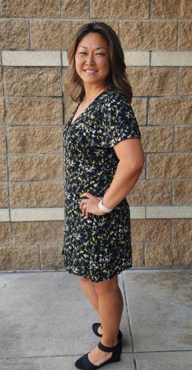 Upgrade your wardrobe with this Floral V-Neck Short Sleeve Dress! Its black ditzy floral print is perfect for any occasion, while the v-neck and ti...
