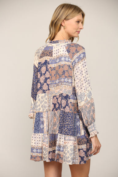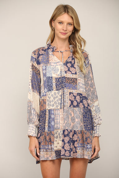 Be a showstopper in this Patchwork Print Long Sleeve Dress! The blue patchwork print, long sleeve design, and lurex strip add an edgy yet playful t...