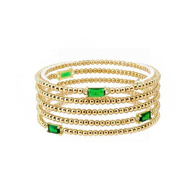 This 5-strand stretch bracelet features delicate gold beads paired with vibrant emerald stones, offering a comfortable fit and a subtle touch of el...