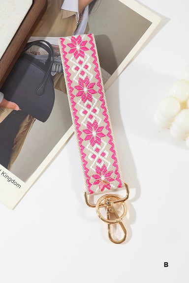 Keep your keys stylishly secure with the Jacquard Weave Wristlet Keychain in Pink. Featuring a trendy woven pattern and durable gold hardware, this...