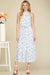 Indulge in summer with our Sleeveless Woven Print Midi Dress! The halter neck and tiered design create an elegant silhouette, while the waist tie provides a flattering fit. Made with a lightweight woven fabric, this dress features a charming blue print on a crisp white background. Perfect for any sunny occasion!