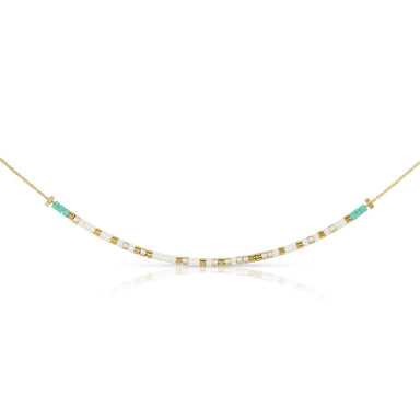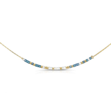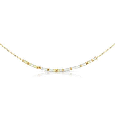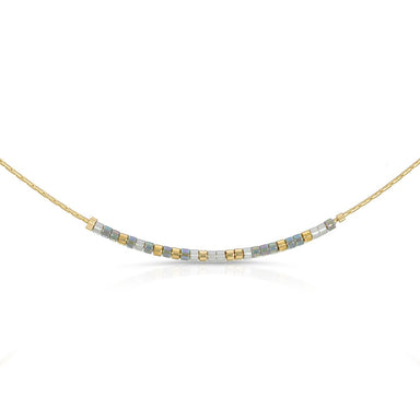 The Crane necklace has faceted crystal tube beads with golden spacers that float on delicate baby chain. 16" length with 2" extender.