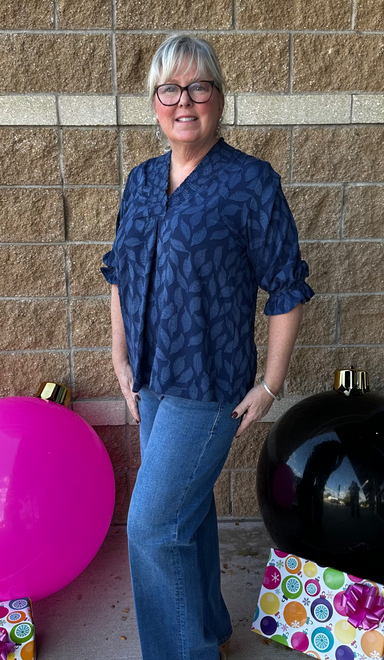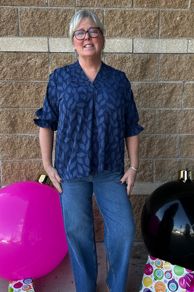 This navy floral jacquard top is your go-to for understated style. The V-neckline features gentle ruching that creates flattering texture, while th...