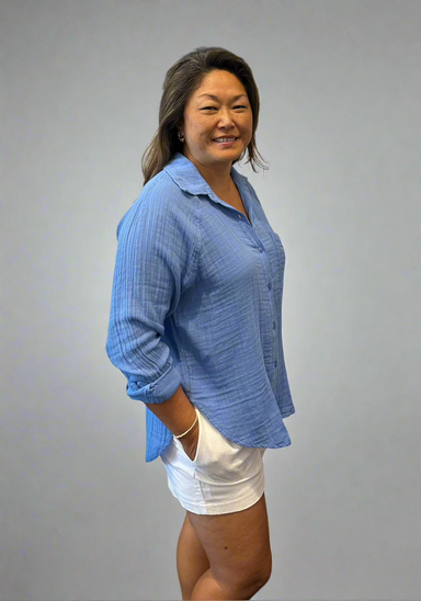 The Perfect Airy Top in Bay Blue offers effortless style with its collared, button-front design. Crafted from 100% Crinkle Cotton Gauze, this light...